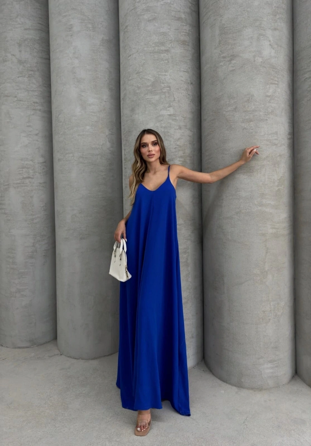 Aerobin marka saks mavisi uzun elbise, gardırobunuzun vazgeçilmezi olmaya aday! Hem şık hem de rahat tasarımı ile her tarza uyum sağlar.