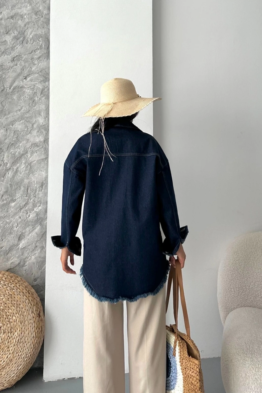 Cepli püsküllü kar yıkama kot ceket koyu mavi d2515