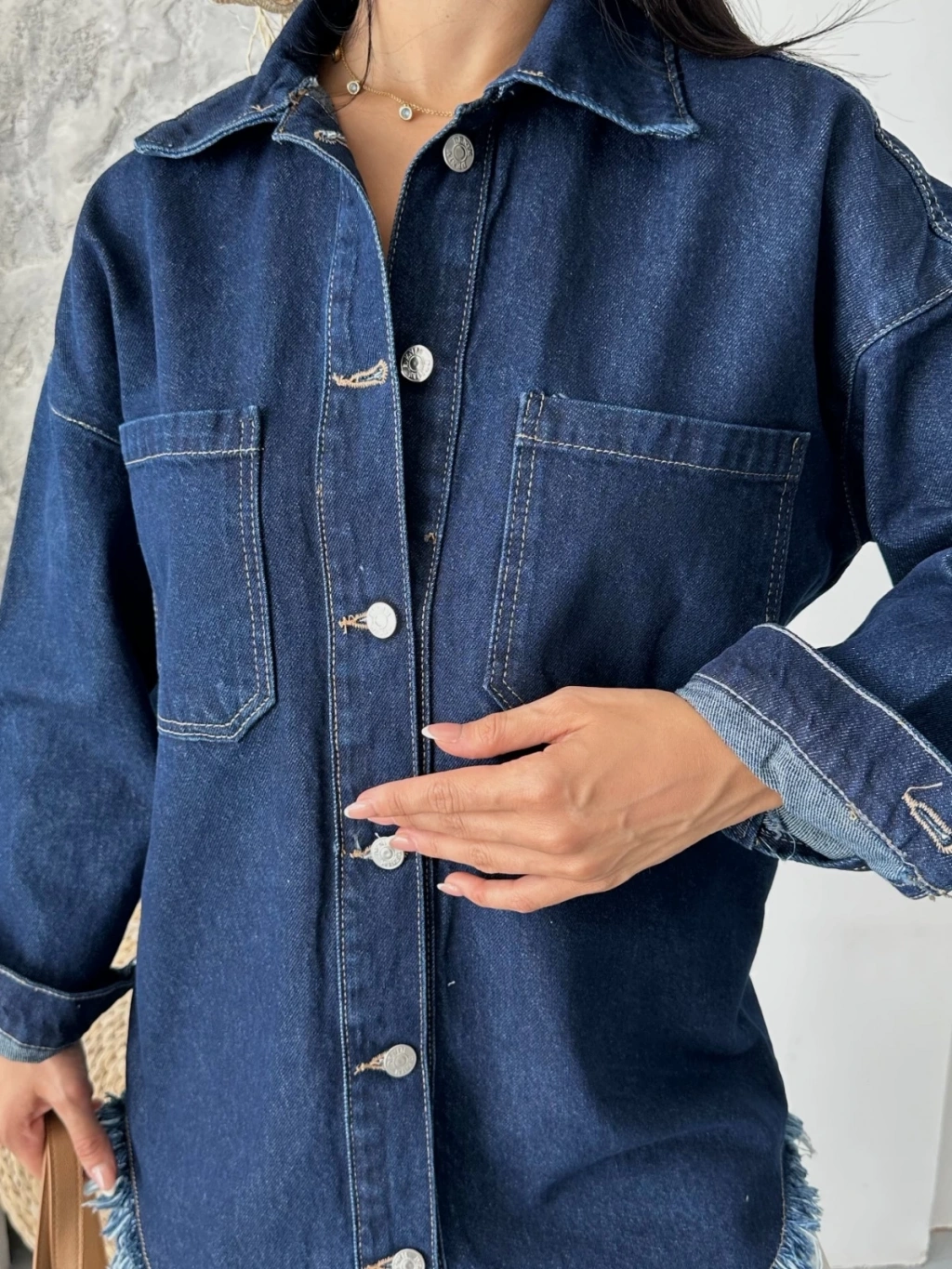 • Cepli püsküllü kar yıkama kot ceket koyu mavi d2515