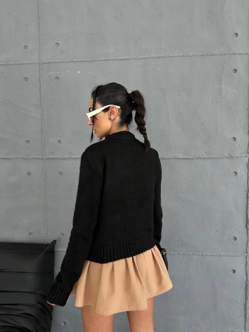 Yeni sezonda trend olan cepli triko kazak siyah rengiyle öne çıkıyor. Hem şık hem de kullanışlı olan bu kazak, gardırobunuzun vazgeçilmezi olmaya aday. İnce triko kumaşı sayesinde hafif ve rahattır.