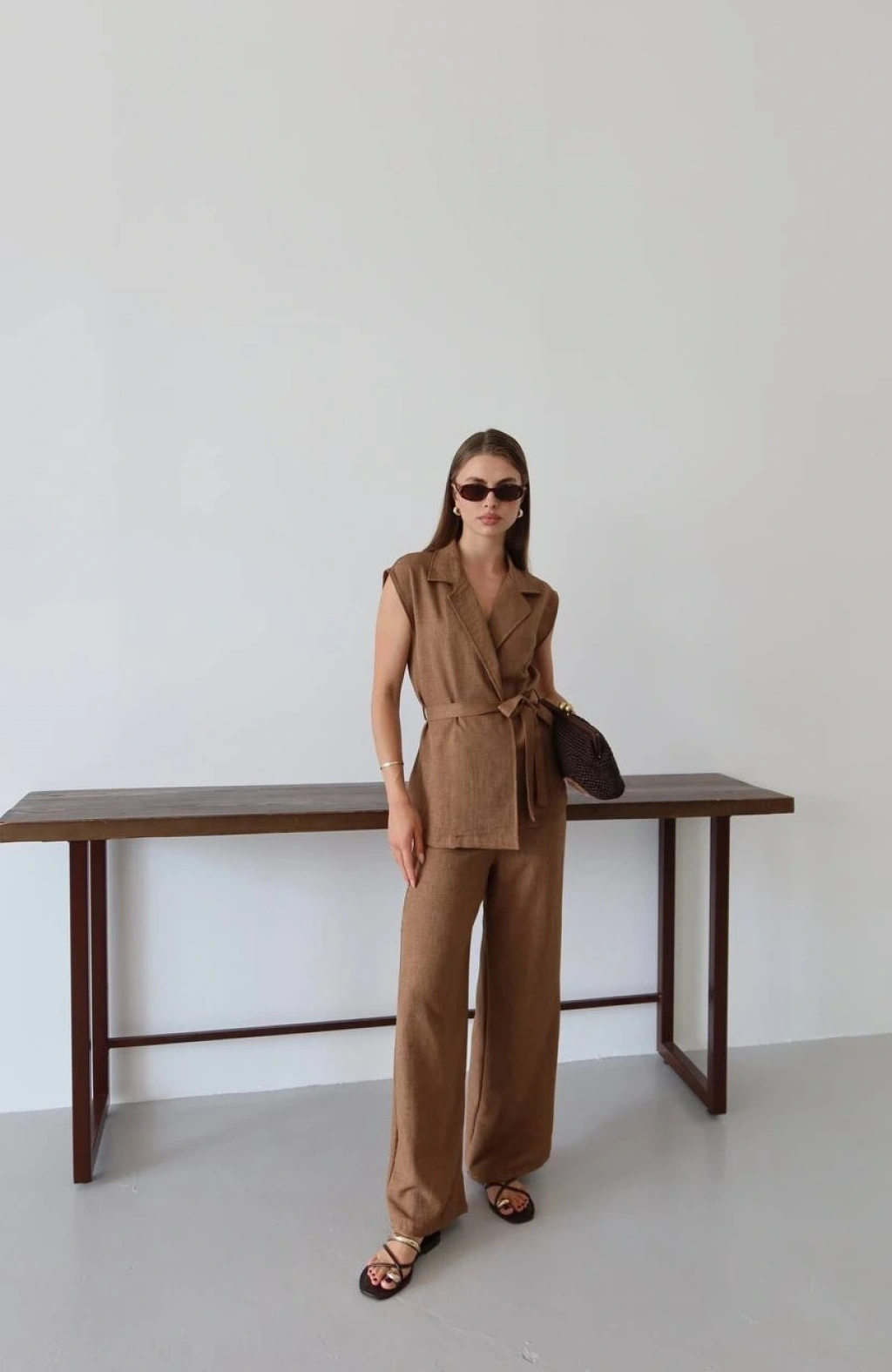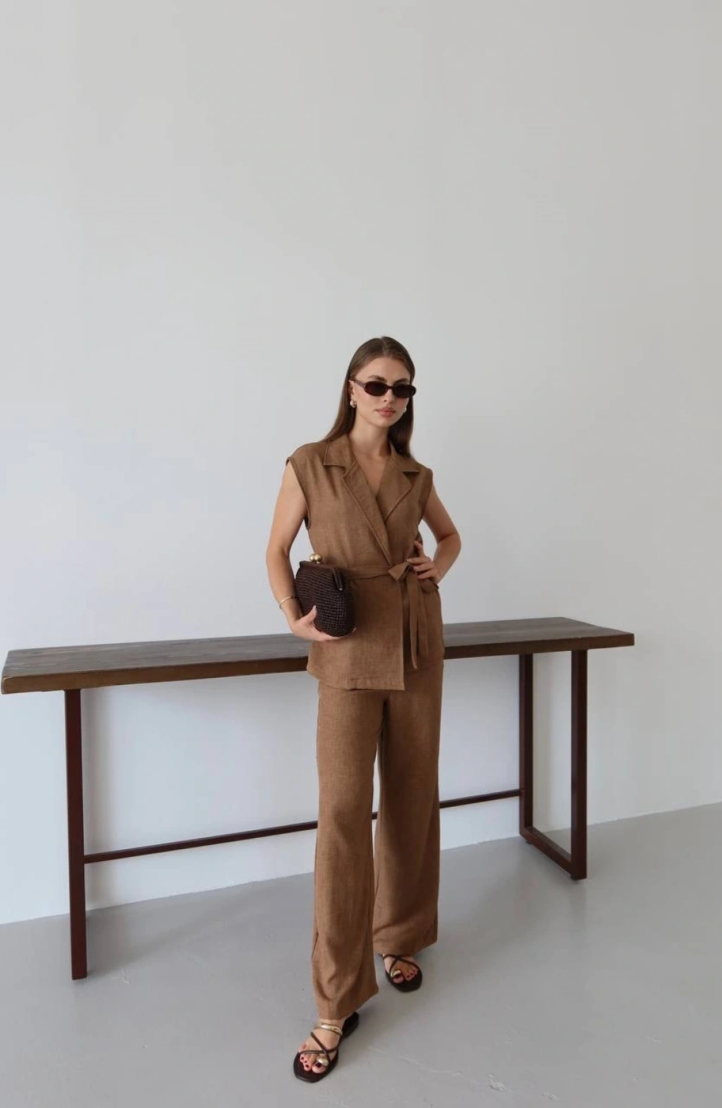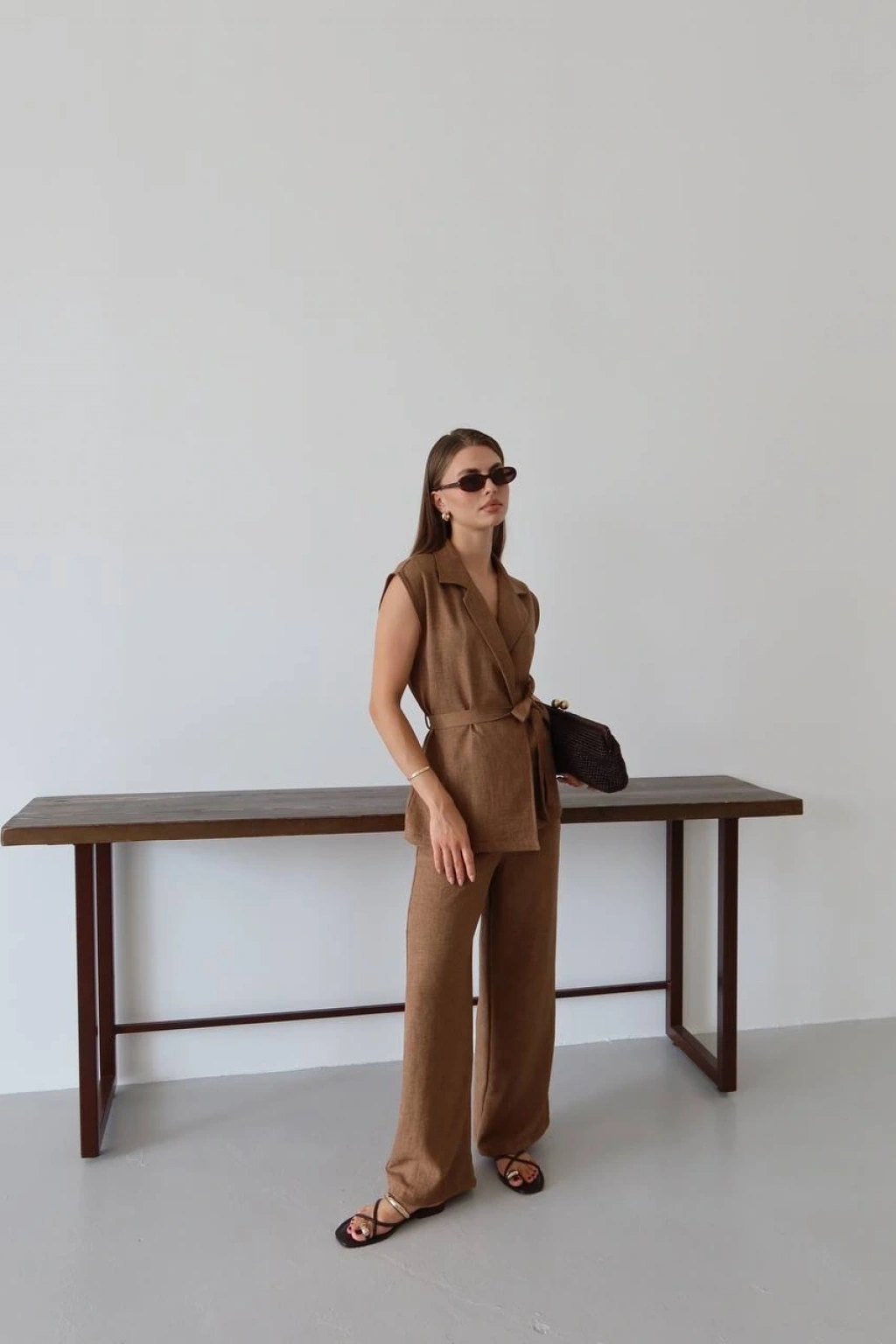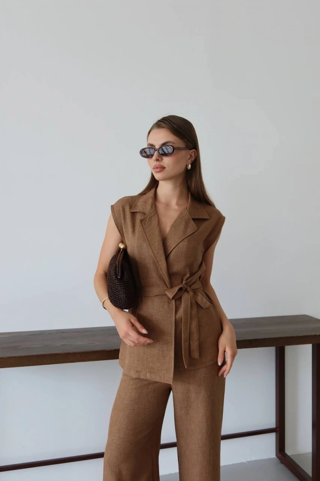 Kahve Keten Yelek Pantolon Takımı ile şıklığınızı ön plana çıkarın. Bu takım, feminen tarzınızı yansıtırken rahatlığı da bir arada sunar.
