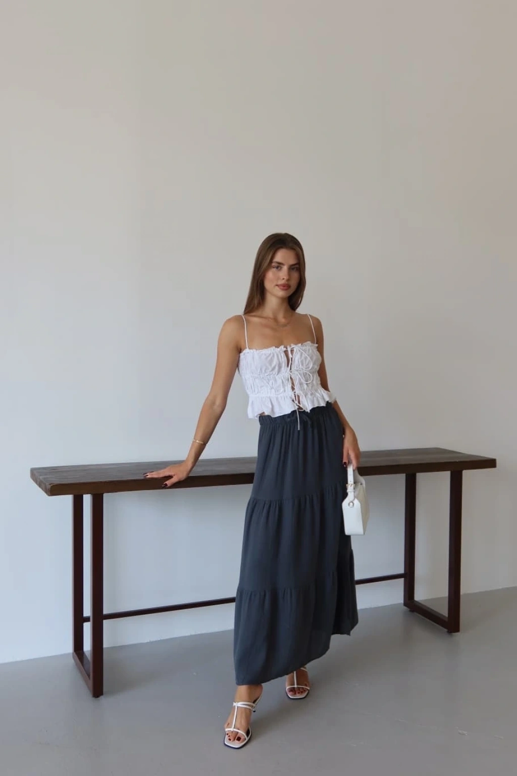 Yüksek kaliteli müslin ve keten karışımı ile üretilmiş uzun etek, gardırobunuzun vazgeçilmezi olmaya aday. Antrasit rengiyle şıklığı ve zarafeti bir arada sunan bu etek, her tarza kolaylıkla uyum sağlar. Rahat kesimi sayesinde gün boyu konfor sunarken, şık detaylarıyla da göz kamaştırır.