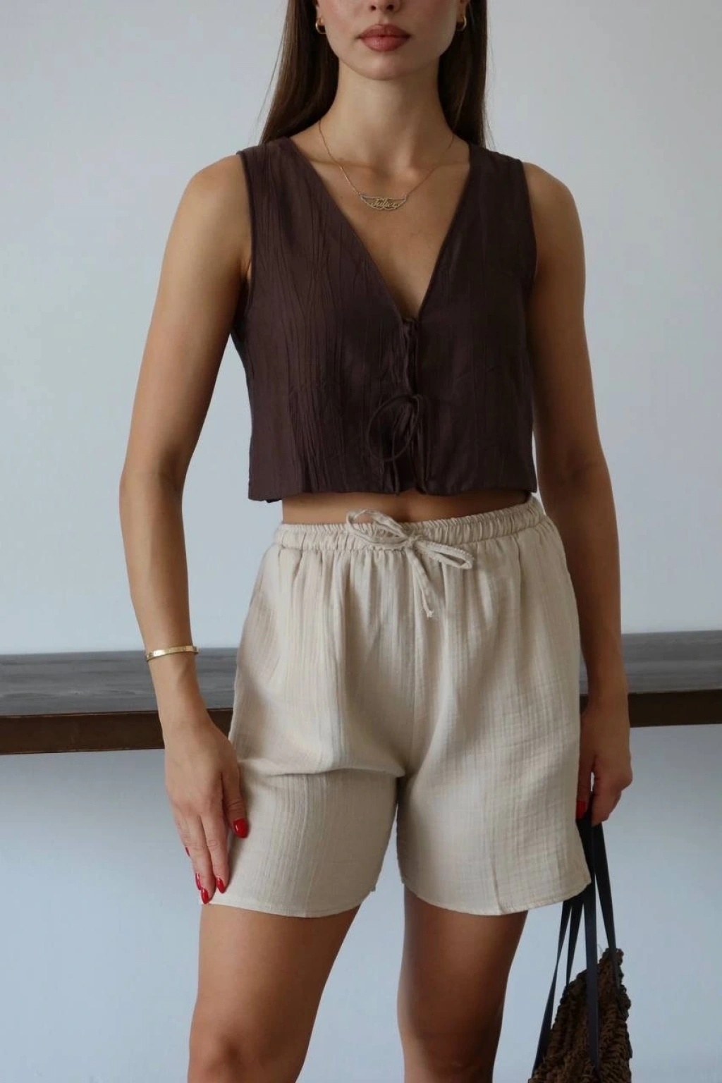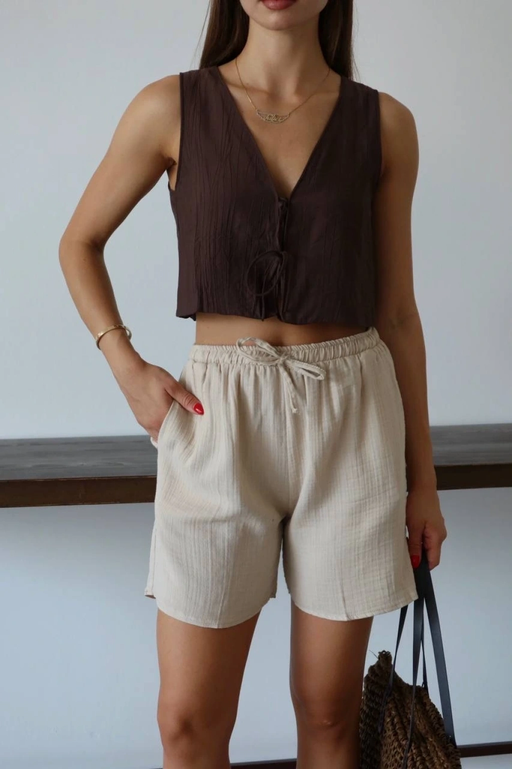 Bu bağcıklı bej şort, hem şık hem de rahat bir seçenektir. Müslin kumaştan üretilmiş olan bu şort, yaz aylarında vazgeçilmeziniz olmaya aday. İster günlük kombinlerinizde ister plajda şık bir alternatif arıyorsanız, bu şort tam size göre!