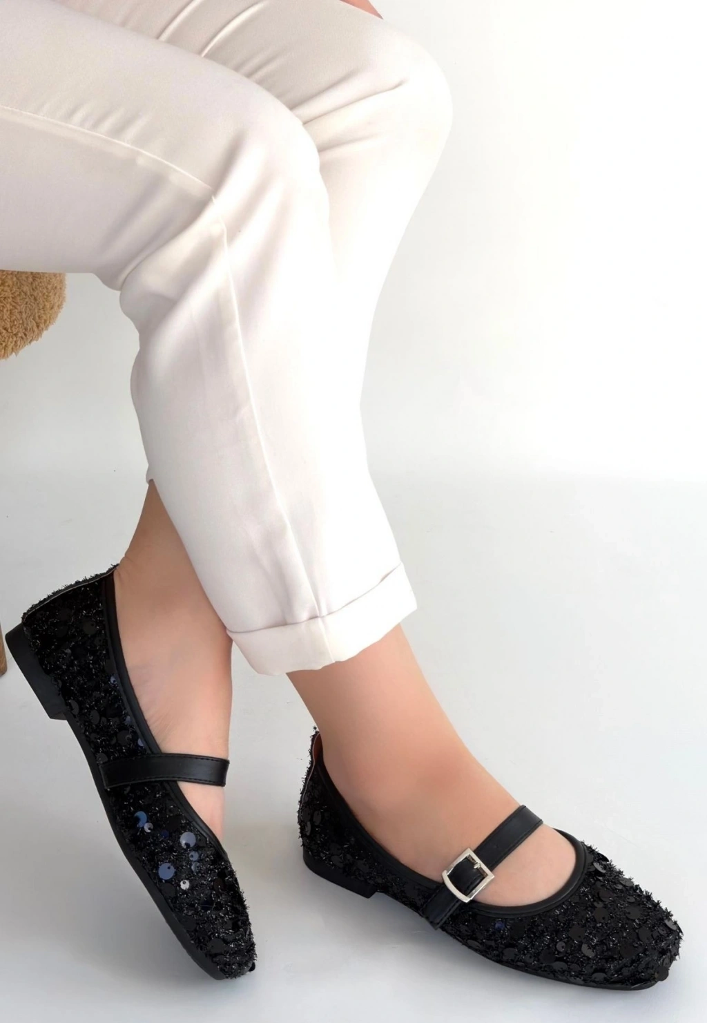 • Zaty Siyah Süet Siyah Pullu Babet Ayakkabı